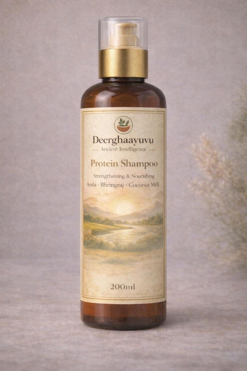 Hair requires protein to maintain its strength and structure. Deerghaayuvu Protein Shampoo is prepared using nourishing herbal ingredients along with natural egg protein derived from naatu eggs.